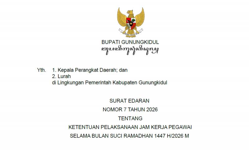 Karangasem (SIDA) - Pemerintah Kabupaten Gunungkidul menerbitkan Surat Edaran Nomor 7 Tahun 2026 tentang Ketentuan Pelaksanaan Jam Kerja Pegawai Selama Bulan Suci Ramadhan 1447 H/2026 M. Surat edaran tersebut ditetapkan di Wonosari pada 12 Februari 2026 oleh Bupati Gunungkidul, Endah Subekti Kuntariningsih, S.E, M.P. Penyesuaian jam kerja selama bulan suci Ramadhan ini ditujukan untuk menjaga keseimbangan antara produktivitas pelayanan publik serta kekhusyukan ibadah puasa.
